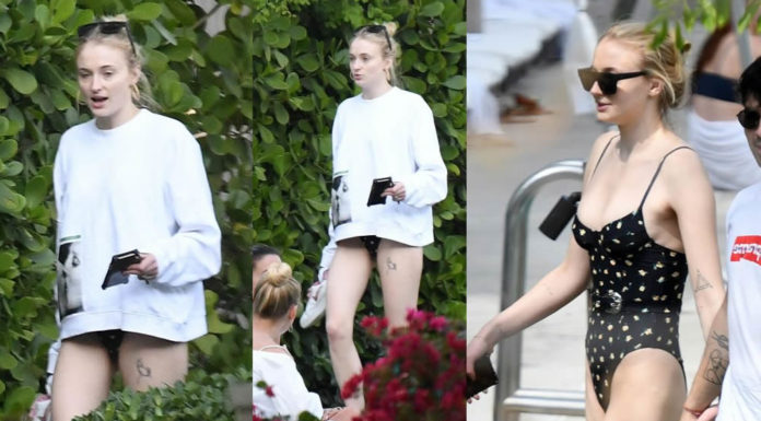 Sophie Turner Upskirt - Wears a black belted swimsuit in Miami, 03232019