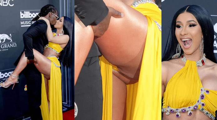 Cardi B upskirt wows in a yellow dress on the red carpet kissing with Offset at the 2019 Billboard Music Awards at the...