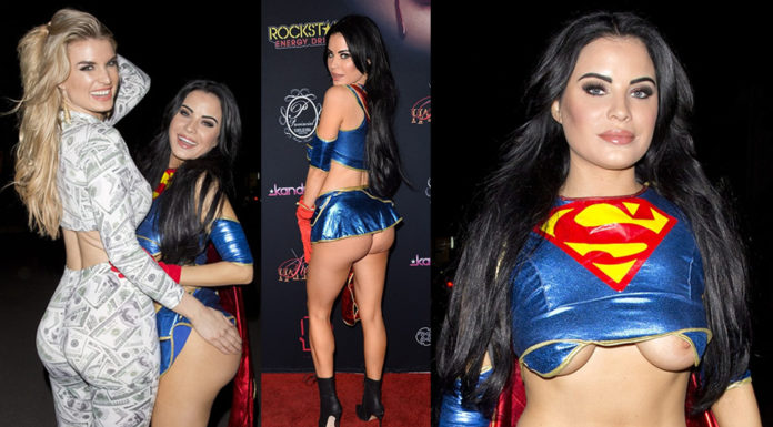 Carla Howe Upskirt + Nipple Poses on the red carpet at The Karma Halloween Party