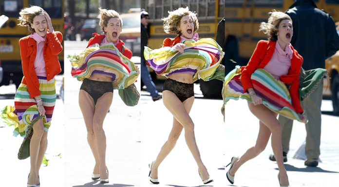 Sarah Jessica Parker Upskirt – deals with wind and rain while filming an episode of ‘Sex and the City’